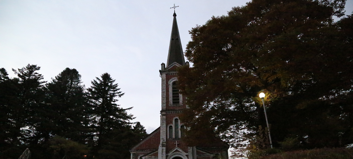 고요하게 저물어가는 저녁, 오래 된 성당 앞을 밝히고 선 등 하나가 아름답다.