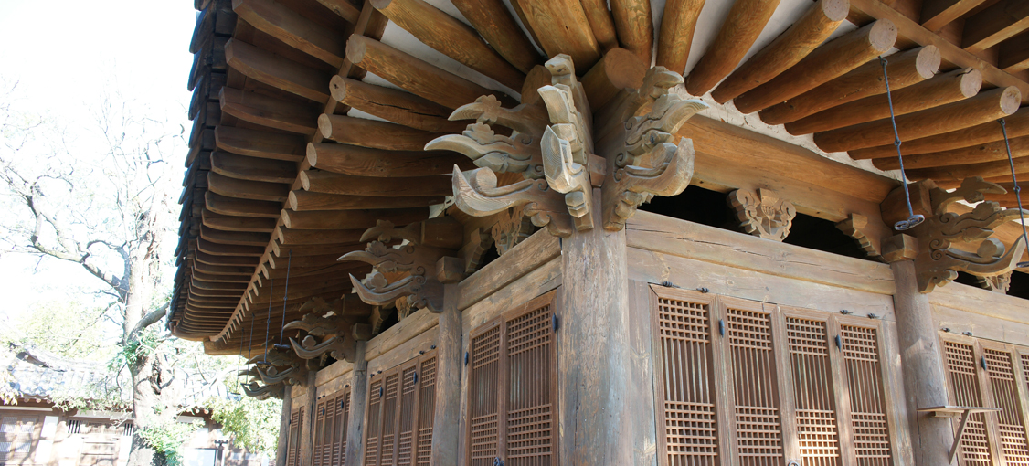 오래된 집들에서는 종종 숨바꼭질이 벌어지곤 한다. 올려다보니 문득, 모퉁이에 소담스레 꽃이 피어 있다.
