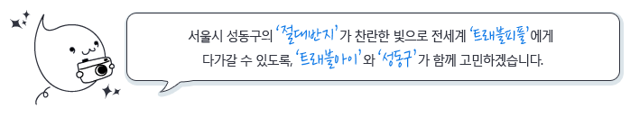 한강, 청계천, 중랑천 등과 접하여 서울에서 가장 많은 수변 구간이 조성된 성동구는 살곶이가 끝나는 곳에 한강이 있었다, 한강 덕택에 이곳 사람들은 예전부터 여유로운 생활을 하는 등 조선 시대부터 성동구는 사람중심의 평화로운 고장으로 전해진다. 600여 년의 조선왕조 역사와 서민들이 분주히 살아가던 왕십리, 새로운 자연생태 쉼터로 떠오르는 서울숲 등의 명소들이 성동구를 대표하는 랜드마크로 자리 잡고 있다.