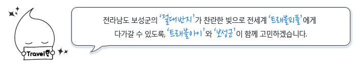 보성은 3경과 3향의 고장으로 전라남도 남부 중앙에 위치하여 산, 바다, 호수가 어우러진 고장이다. 국내 최대를 자랑하는 녹차밭과 조정래의 소설 <태백산맥>의 배경으로 유명하며, 국내 수산물 지리적 표시 등록 제1호인 벌교꼬막, 공룡알 화석지 등 천혜의 자연과 다양한 관광자원을 지니고 있다.