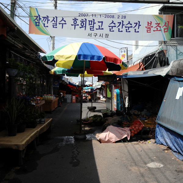 1980년에 생겨나 30여년 동안 이어오고 있는 서구시장! 45개 점포로 이루어진 소형시장이자 상가 건물형 시장이다. 그리고 배추, 무, 돈육 등의 농수산물과 여러 상품들과 음식들을 거래하고 있으며, 그 중에 붕장어와 곱창이 유명하다. 이러한 서구시장은 아침 8시에 영업을 시작하여 저녁 8시에 문을 닫는다.
