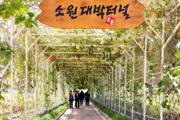특히 눈에 띄는 것은 소원대박터널이라는 이름이 달린 넝쿨터널길. 수세미와 조롱박이 조롱조롱 매달려 익어가는 이 곳에서는 제각기 염원을 담아 매달아 놓은 메모장이 햇살에 노릇노릇 익어간다. 대박이라는 이름이 붙은 연유도 이 터널에 열려있는 조롱박에서 온 것이 아닐까 싶을 정도로 가득히 매달려 있는 모습은 안성맞춤공원의 명물로 자리 잡고 있다.