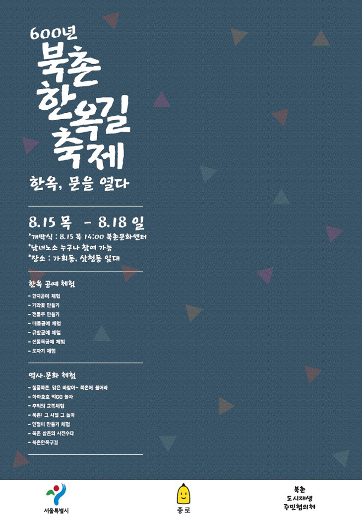 한편 종로구는 북촌 고유의 지역자산 ‘한옥’을 중심으로 역사문화특화형 도시재생사업을 추진하고 있다. 지난 4월 도시재생사업 후보지로 북촌이 선정됨에 따라 주민 33인으로 구성된 북촌 도시재생 주민협의체를 구성하고 열두 번의 주민협의체 정기회의를 열었다. 그 결과 이번 「600년 북촌 한옥길축제 “한옥, 문을 열다”」를 개최하기로 결정, 축제 이후에는 본 사업 추진성과를 바탕으로 10월 서울시 중심지형 도시재생 후보지 성과공유회에 참여하고 북촌 일대가 도시재생 활성화지역으로 선정될 수 있도록 박차를 가한다는 계획이다.
