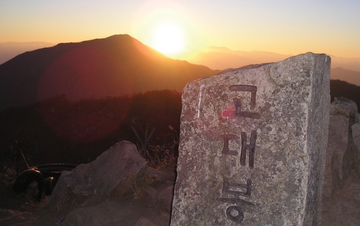 정상에서 만나볼 수 있는 표지석. 고대산 캠핑리조트를 이용한다면 사진 속의 아름다운 일출을 감상할 수도 있겠다.