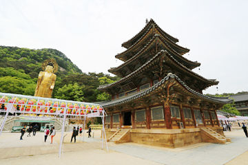 • 국내 유일 오층 목탑인 '법주사팔상전'의 뒤로 금동미륵대불의 모습이 보인다.
