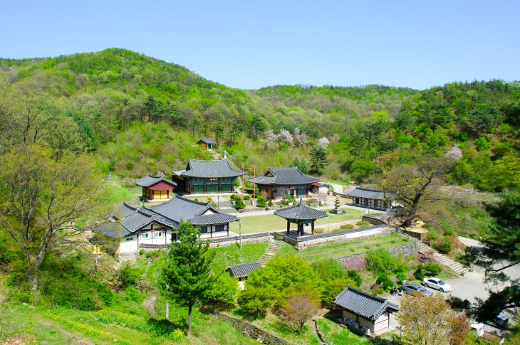 비암사 전경. 비암사에서 운주산성 방면으로 조금만 오르면 비암사를 한눈에 내려다볼 수 있다.