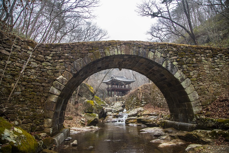 經過石柱以後, 繞過彎路就會看到美麗的彩虹橋。這就是升仙橋。雖然橋呈現半圓形, 但從溪谷下面看時, 與水的反射形成了壹個圓形。因為花崗巖被修整得越往下越窄, 所以僅靠石頭的向心力, 橋梁也非常堅固。