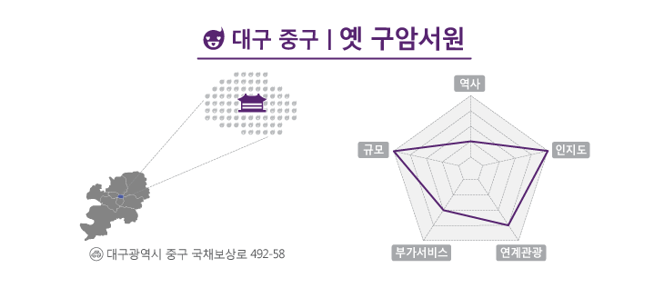 옛것은 그대로의 아름다움을 인정받고 보존되고 있는 곳도 있지만 속속들이 아름다움이 간직한 채 초야에 묻혀있는 곳들도 많다. 잡초에 묻혀있다 최근에서야 고택숙박체험으로 새롭게 변화된 옛 구암서원이 그곳인데 다른 서원과 달리 대구광역시의 중심지에 위치하여 더욱 색다른 경험을 선물한다. 주택가 골목 사이사이로 들어서다보면 옛 구암서원을 알리는 벽화를 먼저 만나게 된다. 안내판과 벽화를 따라 들어서면 넓은 마당이 엿보이는 구암서원이 제 모습을 드러낸다.