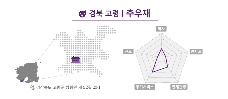화산재를 지나면서 산자락을 향해 길이 꺾어지는데, 이 길을 따라가다 야트막한 언덕길로 올라서면 맨 끝 산비탈에 사당처럼 생긴 집 한 채를 볼 수 있다. 바로 추우재다. 1912년에 지어진 추우재는 전통한옥이 많은 개실마을에서도 꽤 오래된 건물 중 하나로, 정면 3칸의 팔작지붕을 이고 있는 아담한 건물이다. 왼쪽 한 칸에는 대청마루를 들이고 오른쪽 두 칸을 터서 큰 방으로 사용한다. 크진 않지만 일가족이 머물기엔 부족함이 없다.