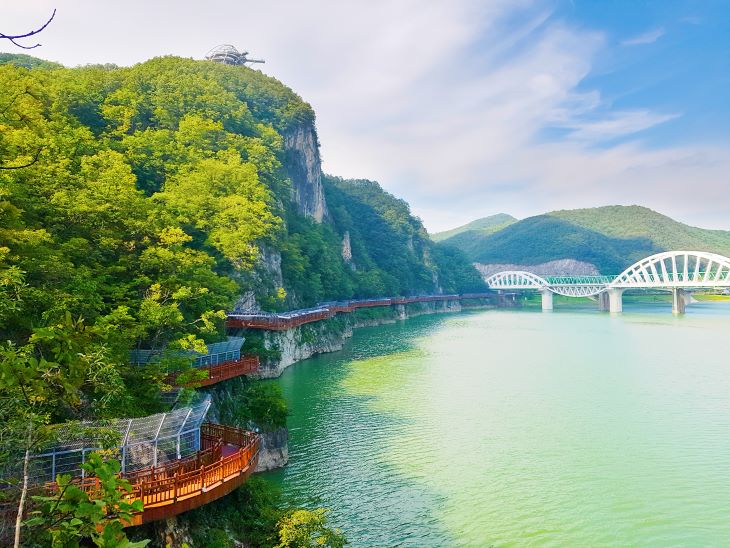 단양 도심을 걷는 도보 여행의 화룡점정은 단양강 잔도다. 전국적으로 큰 인기를 끌고 있는 단양강 잔도는 강변길의 끝자락인 단양읍 상진리(상진대교)에서 적성면 애곡리(만천하 스카이워크)를 잇는 길이 1천 200m로 조성됐다. 이 길은 총 연장 중 800m 구간은 강과 맞닿은 20여m 암벽위에 설치돼 강물 위에 있는 환상과 함께 걸을 때마다 짜릿한 스릴과 재미를 온몸으로 체험할 수 있다.