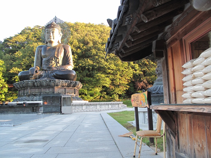 신흥사를 향해 외설악 입구인 설악동 소공원을 떠나면, 금세 숲이 울창해지고 웅장한 신흥사 일주문이 나온다. 사찰의 경계를 뜻하는 일주문에 들어서자마자 만날 수 있는 것이 바로 세계 최대 높이 14m에 달하는 통일대불. 이는 통일 기원의 뜻을 담은 청동 석가모니 상으로 신흥사의 상징 격이다. 대불의 몸 안으로 난 계단을 통해 지하법당으로 내려가 기도를 올릴 수 있다. 꼭 불교신자가 아니더라도 경건하게 손을 모으게 되는 공간이다.