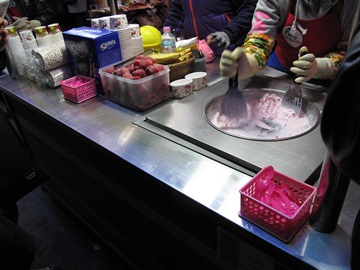 야시장에는 별미가 많다. 다양한 맛의 철판 아이스크림도 인기.전주 남부시장이 얼마 전부터 더욱 떠들썩해진 까닭은 밤에도 불이 꺼지지 않기 때문. 서울의 번화가가 아니라, 2014년 10월부터 개장한 남부시장의 야시장 이야기다. 이는 청년몰에서 매주 금, 토요일 갖가지 길거리 음식과 프리마켓, 문화공연이 이뤄지는 밤 시장으로, 낮의 그것과는 색다른 분위기를 느낄 수 있다. 장터라기보다는 축제장에 가까운 느낌이다. 길 중앙으로 길게 늘어선 간이 부스에는 시장이라고는 믿기지 않을 만큼 다양한 야식을 파는데, 바나나 튀김, 칠리소스 고기만두 등 호기심을 자극하는 메뉴들이라 특히 야시장은 젊은이들로 북적인다.