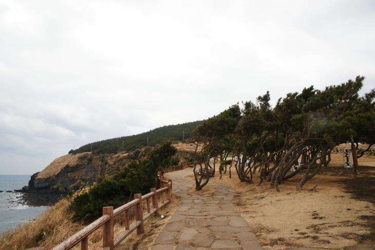오랜 세월 해풍을 맞은 알뜨르비행장의 나무들이 육지를 향하여 기울어 있다.