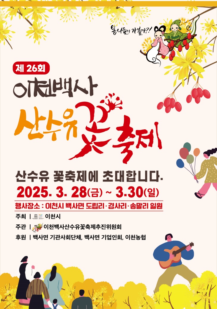 백사면 경사리, 도립리, 송말리 일대의 아름다운 산수유 군락지를 배경으로 지역 주민들이 중심이 되어 개최되는 이천백사산수유꽃축제는 올해로 제26회를 맞이했다. 올해도 어김없이 이른 봄 준비를 시작한 백사면 주민은 상춘객 맞을 준비에 여념이 없다. 축제 첫날인 3월 28일(금) 오후 2시에 개막식을 시작으로 봄꽃 놀이와 함께 각종 체험, 공연 및 전시 등 다채로운 행사가 개최될 예정이다.