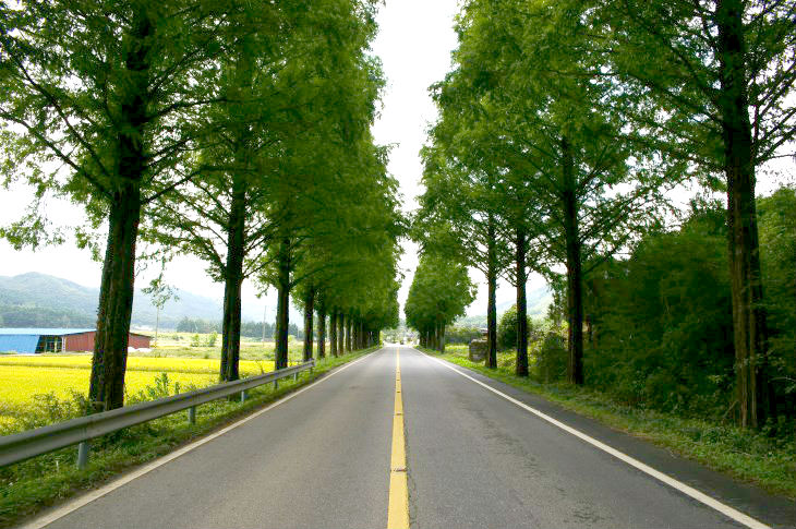 메타세쿼이아 길이 펼쳐져 있는 24번국도는 운치 있는 드라이브 코스로도 인기가 높다. 메타세쿼이아 길이 만드는 초록 터널은 흡사 동화 속 어디쯤인 것 같은 착각을 불러일으킨다. 하늘을 향해 쭉쭉 뻗어 있는 메타세쿼이아의 풍경이 이국적인 듯하면서도 정겹게 느껴진다. 그 사이를 달리고 있으면, 몸도 마음도 시원해진다. 메타세쿼이아 길은 사계절 다른 매력을 뽐낸다. 봄에는 짙은 갈색 가지에 푸른 새순이 돋아나고, 여름이면 초록이 울창하며, 가을에는 단풍이 가득하다. 겨울 설경은 이루 말할 수 없이 아름답다. 이처럼 사계절 아름답지만, 역시 드라이브를 하기에 가장 좋은 계절을 꼽으라면 여름을 들겠다. 잠시 차를 세워 걸어도 좋고, 창문을 열고 메타세쿼이아가 뿜어내는 피톤치드를 들이마셔도 좋으니 말이다.