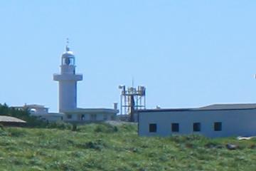 섬의 끝에 아득히 서 있는 마라도 등대의 모습.