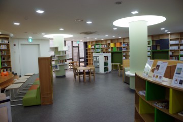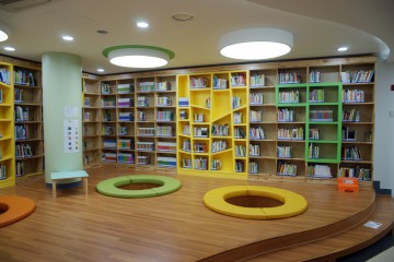 내부 열람실의 모습. 책장 위에는 추천도서를 소개하는 게시물이 세워져 있다.지하로 내려가면 알록달록한 열람실이 나온다. 아이들을 위한 키즈존에는 마루바닥과 함께 폭신폭신한 우물모양의 자리를 배치했다. 노란 책장과 경쾌한 색감의 자리가 어울려 톡톡 튀는 분위기를 연출한다. 다른 한 쪽에도 나무 탁자와 의자가 갖춰져 조용히 책을 읽고 싶은 사람들에게 개방되어 있다. 조금 다른 분위기를 접하고 싶다면 지층에 있는 북카페나 일층의 세미나실에서 책을 읽는 것도 좋겠다.