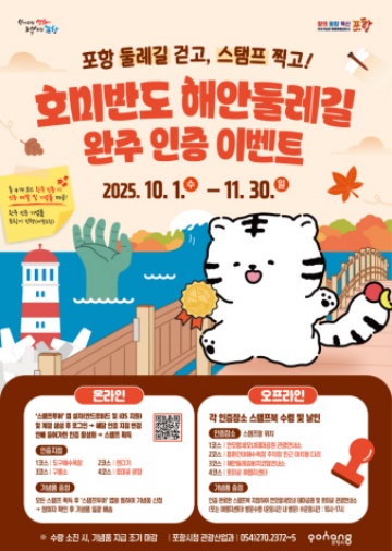 포항시는 문화체육관광부의 ‘여행가는 가을’ 캠페인에 맞춰 11월 30일까지 ‘호미반도 해안둘레길 걷기 인증 이벤트’를 진행한다.