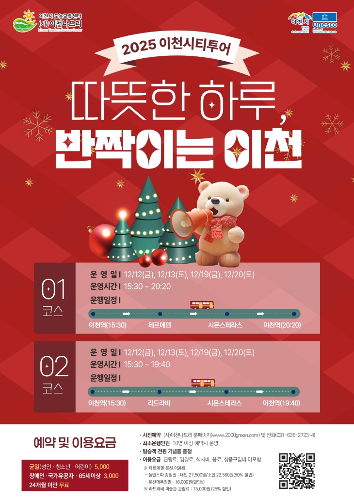 이천시(시장 김경희)는 오는 12월 12일부터 20일까지 매주 금·토요일, 겨울철 야간 관광의 매력을 담은 기획 시티투어 ‘따뜻한 하루 반짝이는 이천, 12월 시티투어’를 운영한다.