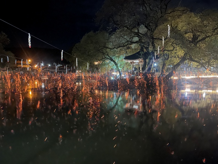 낙화놀이의 명당 중 명당! 수천 개의 불꽃이 무진정 앞 연못위로 내리는 풍경은 한번 보면 쉽사리 잊을 수 없을 거예요.