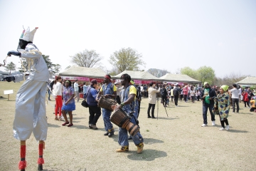 뗀석기로 자른 생고기를 굽고 있는 아이들과 축제의 흥을 한껏 돋워 주는 아프리카의 이색 원시인(?)들.‘전곡리안’이라는 신조어는 연천군에서 고안해 낸 신조어인데, 선사마을 체험을 조금 더 자세히 들여다본다면 축제를 찾은 사람들을 굳이 전곡리안이라 표현한 이유를 알 수 있을 것. 이 체험은 선사시대의 가죽옷을 입는 것으로 시작되는데, 곧바로 이어지는 체험은 직접 뗀석기를 만들어 생고기를 잘라보는 것. 장작불로 고기를 굽는 것까지가 모두 참가자들의 몫이다. 감자를 캐는데 사용할 수 있는 도구는 역시 간석기(모양의 길쭉한 돌), 집을 짓는데 사용되는 재료는 커다란 나뭇가지들이다.