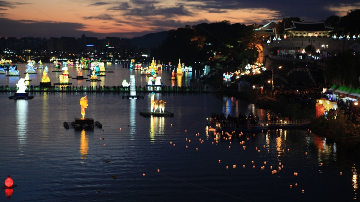진주시 하늘에 노을이 질수록 강 위에 띄워진 등도 제 색을 발하기 시작한다.