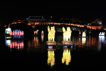 유등축제라는 이름을 단 만큼, 축제의 진면목은 어두운 밤에 드러난다. 진주교, 진양교를 비롯해 성 주변에 붉게 물든 축등은 시작에 불과할 뿐이다. 축제 첫날, 남강 일원에서 오후 8시에 시작하는 수상불꽃놀이는 남강의 검은 물에 반사되어 마치 용궁 같은 풍경을 연출한다. 단 하루뿐이지만, 그렇기에 더욱 눈길이 가는 행사로 이때에는 온 남강 둔치가 북적북적하다.