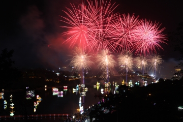 밤하늘과 검은 물까지도 비추는 수상 불꽃놀이.