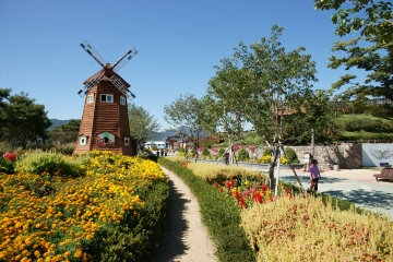 풍차를 배경으로 알록달록함을 내뿜는 꽃들이 앙증맞다.