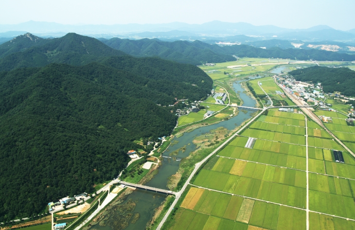 산 아래에서 바라보는 올망졸망 마을과 논밭의 모습