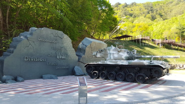 전쟁이 사라지고 아이들의 웃음소리가 가득하길 바라는 놀이터와 탱크이다.