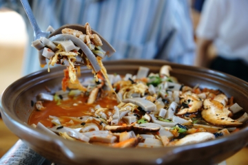 국물이 걸쭉해지도록 끓여도 묵이 부서지거나 하지 않고 원형을 유지할 수 있는 데는 뭐니뭐니해도 전통식으로 묵을 만들어내는 이유가 크다. 오래 저으며 눌어붙지 않도록 계속 휘저었던 만큼 그 조직감이 한층 쫀쫀해져 있기 때문이다. 여기에 다양한 향신료들이 배어드는 묵을 한입, 두 입 건져 먹다 보면 어느새 졸아 들은 국물과 얼마 안 되는 건더기만이 남기 마련. 식당에 따라서는 이렇게 졸아 들은 국물에 밥볶음을 해주기도 하니 쌀로 마무리하지 않고는 영 아쉬운 사람들은 볶음밥까지 알차게 먹어보자.