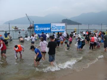 구조라 해수욕장에서 할 수 있는 익사이팅 워터파이트와 맨손고기잡이도 여름의 더위를 한껏 날려보낼 수 있는 체험입니다. 넓게 펼쳐진 모래밭에서 서로 물총을 쏘고 쏘다 보면 옷과 몸은 흠씬 젖어도 상쾌한 기분을 맛볼 수 있습니다. 한편 맨손고기잡이는 그물망을 쳐놓은 바다에서 각종 바다생선을 잡아올리는 체험입니다. 두 손에 목장갑을 장착하면 준비 끝! 미끈하게 빠져나가려 애를 쓰는 물고기를 잡으려면 물고기가 있는 곳을 헤집는게 아니라 물고기가 가려는 방향을 손으로 붙잡는 거라는 팁도 전해드립니다.
