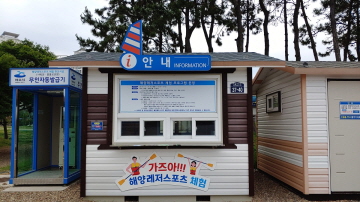 윈드서핑, 딩기요트, 패들보드를 무료체험할 수 있는 웅천친수공원 해변의 안내소